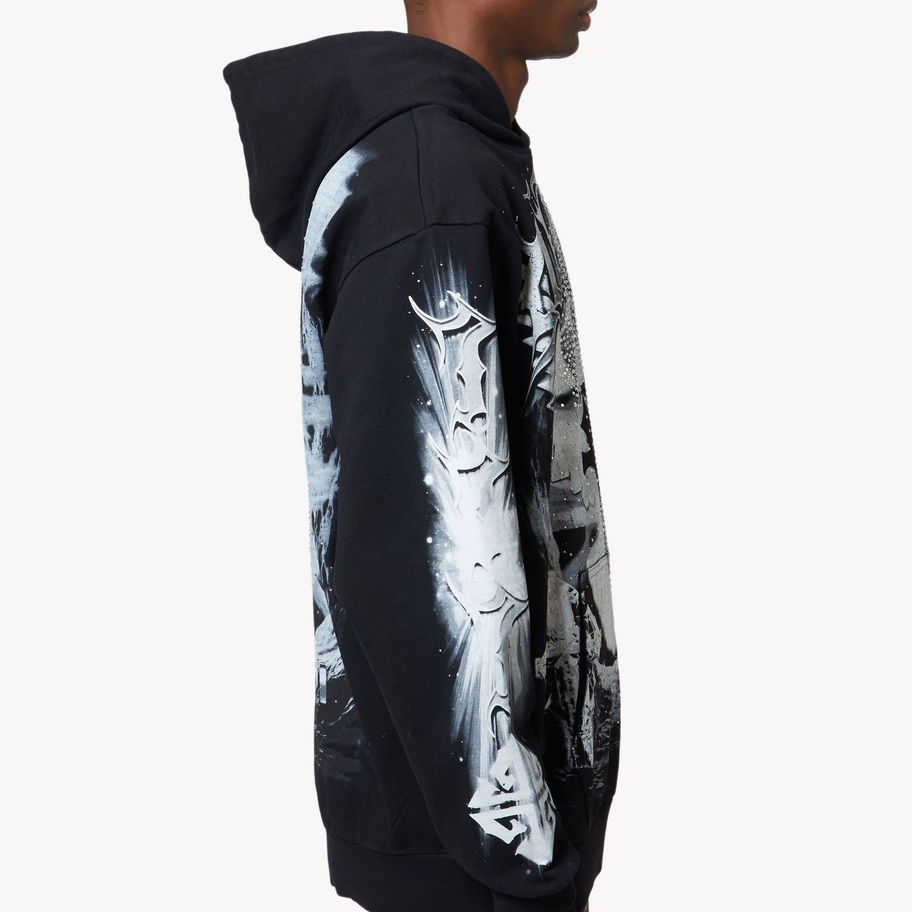 A bold visual statement rooted in GUAPI’s futuristic narrative, the Black Heavens Vault Hoodie V3 brings apocalyptic streetwear into focus with a hyper-detailed, symmetrical graphic treatment. The front showcases a mirrored double-eagle motif fused with celestial textures, skull overlays, and water-like distortions—all drenched in icy tones of white and blue. Rhinestone embellishments illuminate the print with multidimensional shine, adding movement and contrast.