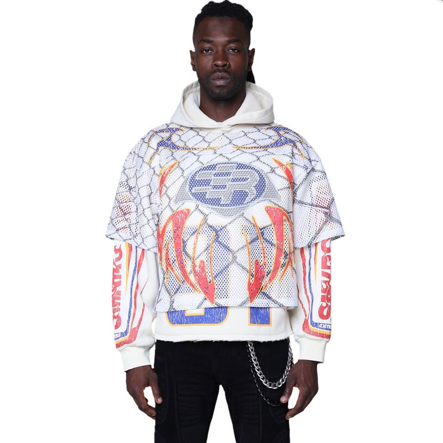 Combines futuristic design and Y2K street influence with a mesh-style overlay, fiery orange graphics, chrome chain-print details, and multi-text sleeves for a standout layered effect. Lightweight fleece interior.