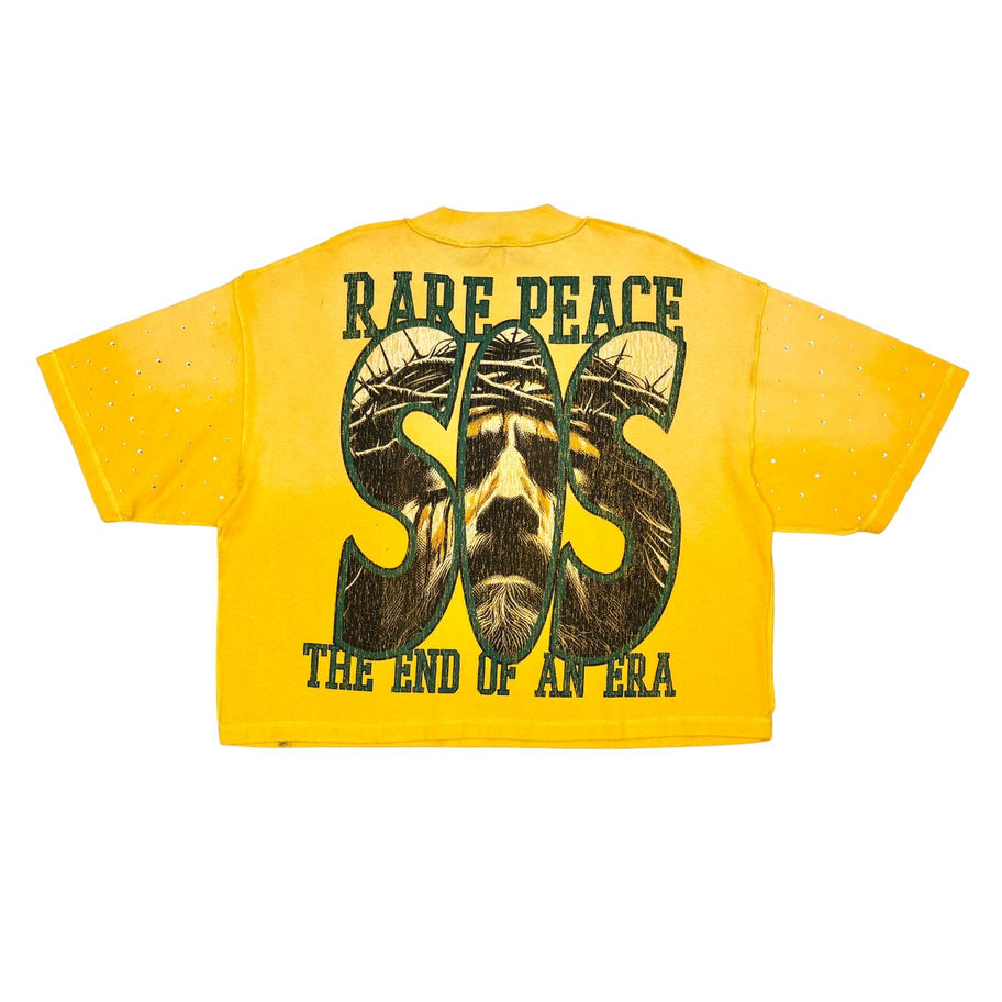 A washed heavyweight tee with rhinestone detailing and washed yellow tone.